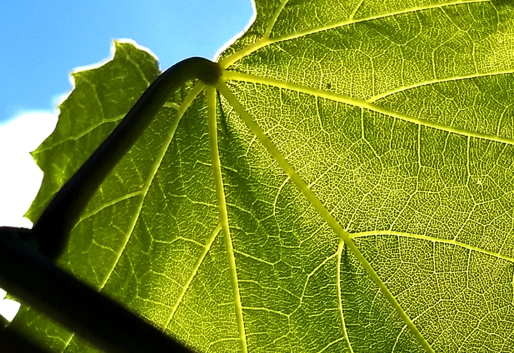 Foto: Als wegen op een oude landkaart zorgen de nerven voor het transport. Naar de druifkes om de wijnboer de kans te geven mooie wijn te maken. Laat de zon maar schijnen !